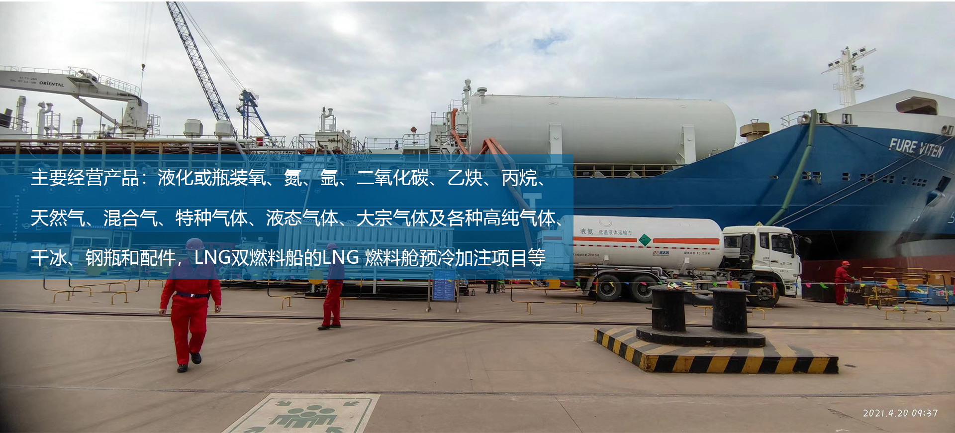 主要經營產品有:液化和瓶裝氧、氮、氬、二氧化碳、乙炔、丙烷、天然氣、混合氣、特種氣體、大宗氣體及各種高純氣體、干冰、鋼瓶、配件等。 LNG雙燃料船的LNG 燃料艙預冷加注項目,提供氣體試驗及LNG燃料加注成套服務,包括(不限于)氣源(LNG&LN2)供應、現場氣試加注服務(技術服務、設備租賃、現場操作及回氣處理等服務)。